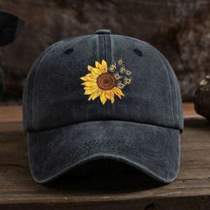 ひまわり刺繍 キャップ 帽子 調整可 ユニセックス 黒697627