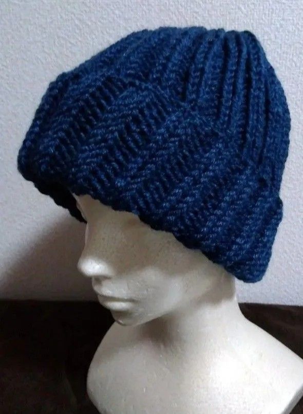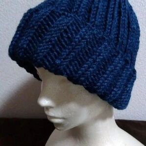 手編み☆ニット帽 インディゴ紺 二目ゴム編み メンズ男性 ハンドメイド ビーニー ニットキャップ No.70 ユニセックス