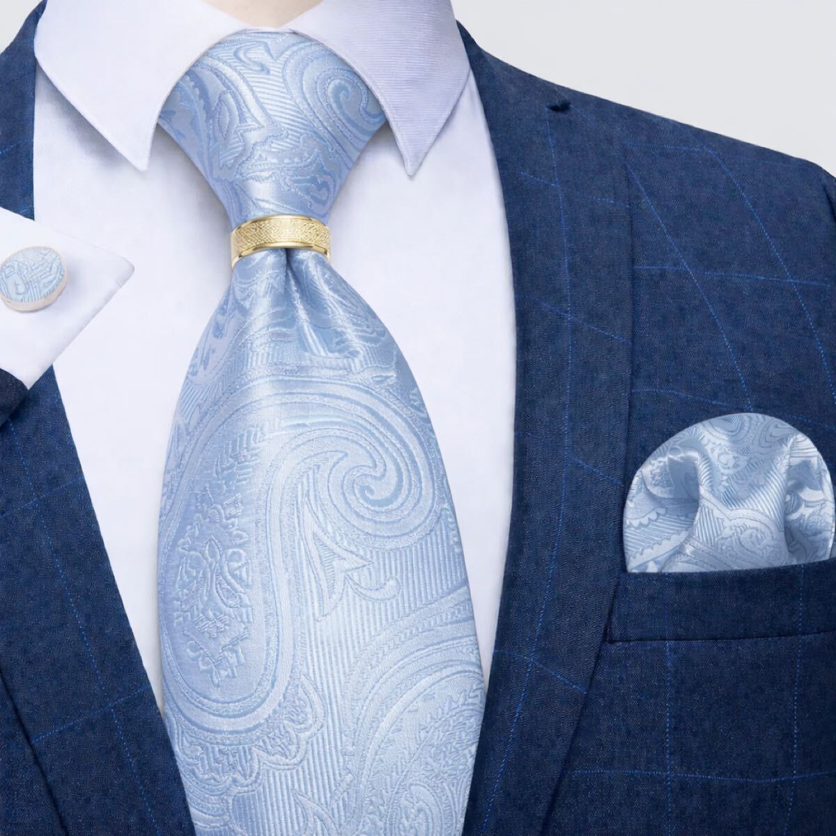 【4点セット】ネクタイペイズリーストライプ結婚式入学式卒業式水色青ブルー白ホワイト金ゴールド