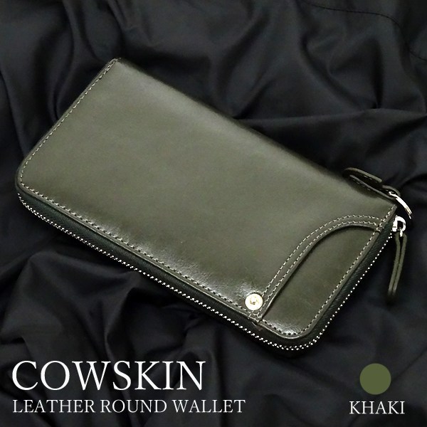 送料無料 訳あり特価 財布 メンズ ラウンドファスナー 牛革 長財布 レザーウォレット カードスライダー付き ラウンドジップ カーキ☆