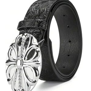 彫刻クロスバックル 型押しベルト メンズ 黒 ゴシック497944