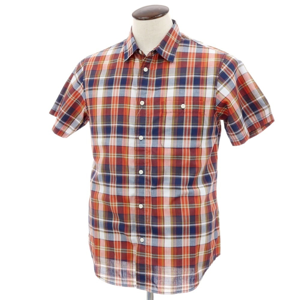 【中古】ザノースフェイス THE NORTH FACE ポリエステル チェック 半袖シャツ オレンジxネイビー【サイズL】【メンズ】